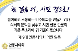 중요뉴스 "한 생명을 품는 일이 세상을 지킨다" 영덕 강구면 '가마솥 추어탕집', 자연산 토종물고기 전통 맛으로 미식가들 몰려 경북녹색환경연합 안동본부,연말 실적보고대회 준비...정화활동으로 마무리 다짐 안동시의회, 「하늘에서 여는 안동의 미래, 드론과 AI가 그리는 스마트 안동」 정책토론회 개최 안동시의회 여주희 의원, “송현초 통학안전 전면 개선” 촉구 안동시의회 김순중 의원,“실효성 없는 탄소중립계획, 안동의 미래 지킬 수 없다” 안동시의회, 제263회 제2차 정례회 개회