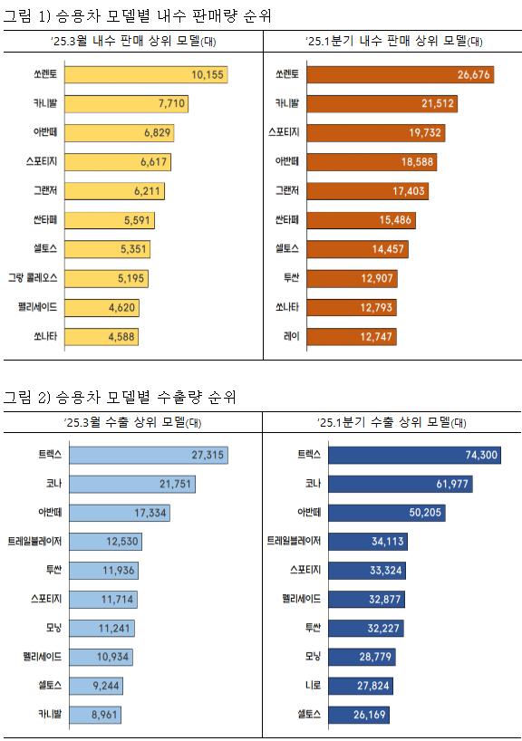 2025년 1분기 자동차 산업은 내수와 친환경차 판매 증가에 힘입어 생산이 소폭 늘어난 반면, 수출은 전년도 고실적에 따른 역기저효과로 소폭 감소한 것으로 나타났다.