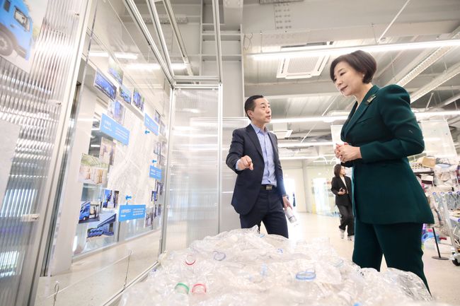 오영주 중소벤처기업부 장관이 7일 경기 화성 수퍼빈(주)에서 열린 `기후테크 스타트업 현장대화` 참석에 앞서 기업 현장을 둘러보고 있다.