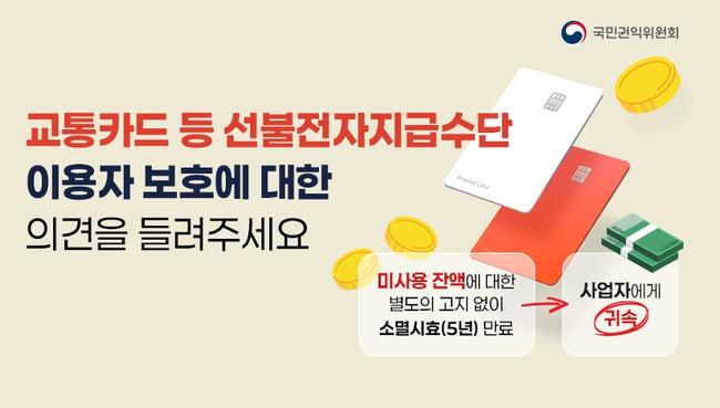 “소멸되는 교통카드 잔액, 어떻게 보호할까?”…국민권익위, 설문조사로 의견 수렴 - 국민생각함 통해 5년 이상 미사용 선불금 귀속 문제에 국민 의견 청취 - 지난 3년간 소멸된 잔액 1,189억 원…소비자 알권리 강화 논의 시동