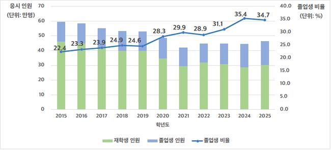 한국교육과정평가원이 국회 교육위원회 소속 더불어민주당 김문수 의원에게 제출한 ‘2016~2025학년도 수능 재학생·졸업생 응시인원 및 비중’ 자료에 따르면, 졸업생 응시 비율은 2016학년도 23.3%에서 2025학년도 34.7%로 상승했다. 10년 만에 11.4% 포인트 오른 셈이다.