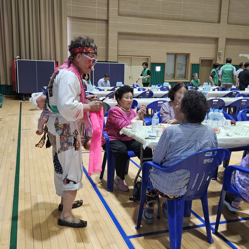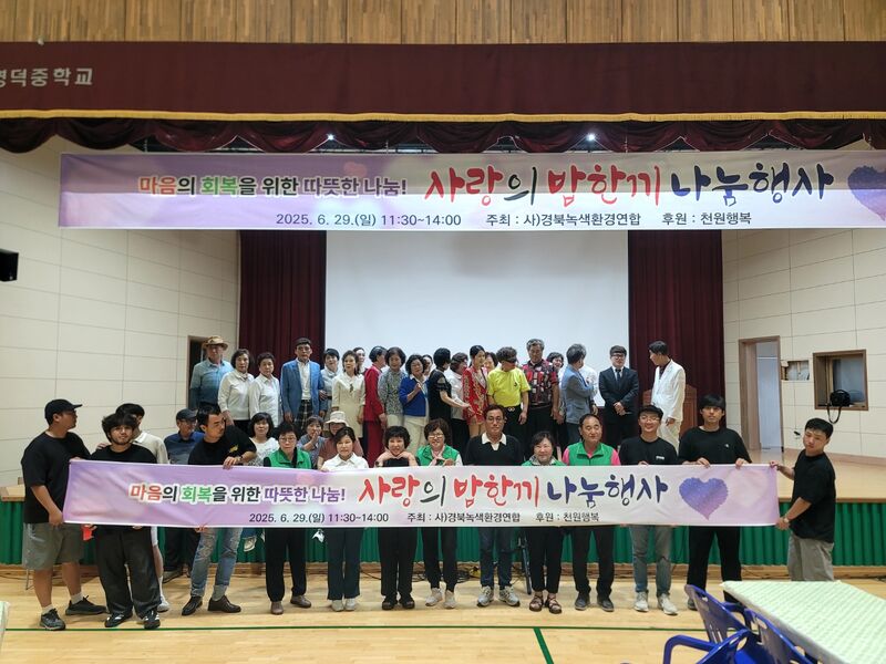 경북녹색환경연합 상임회장 배영달 은 회원들과 함께 지난 6월 29일 (일요일) 영덕군 영덕읍 영덕고등학교 체육관 에서 산불피해 영덕읍 주민 어르신들 400여명 참석한 가운데 밥 한끼 나눔 및 위로공연 행사를 개최 했다