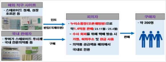 식품의약품안전처는 SNS 오픈채팅방을 통해 스테로이드제제와 성장호르몬제제 등 무허가 의약품을 불법 판매한 혐의로 A씨를 적발해 검찰에 송치했다고 14일 밝혔다. 적발된 무허가 의약품 규모는 1억 4천만 원에 달하며, 이들 의약품은 모두 허가받지 않은 경로를 통해 유통된 것으로 드러났다.