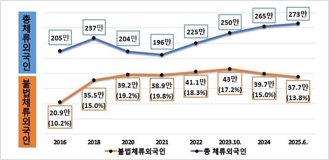 올해 상반기에는 약 2만 3천 명의 불법체류자가 새로 발생했으나, 강제퇴거와 자진출국 조치 등으로 약 4만 3천 명이 정리돼, 전체 불법체류 외국인은 2023년 10월 43만 명에서 올해 6월 37만 명으로 감소했다.