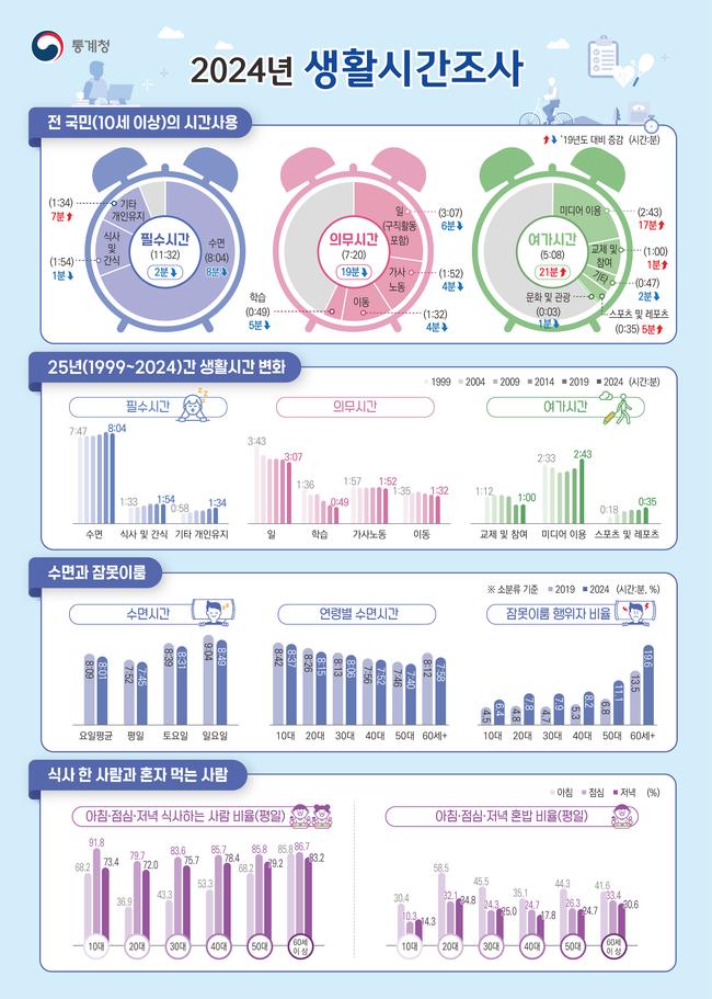 통계청은 7월 28일 ‘2024년 생활시간조사’ 결과를 발표하며, 국민의 사계절 일상시간 활용 실태를 처음으로 반영한 이번 조사에서는 연령 구간 세분화 등 분석 체계가 한층 강화됐다고 밝혔다.