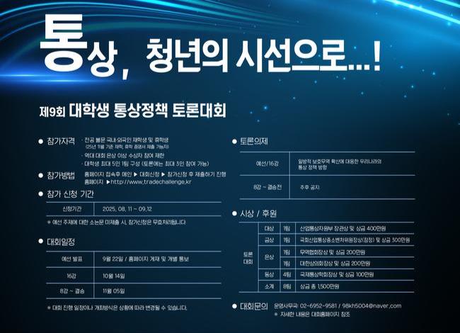 산업통상자원부가 오는 9월 12일까지 ‘2025년 대학생 통상정책 토론대회’ 참가 신청을 받는다. 올해로 9회째를 맞는 이번 대회는 통상정책에 대한 청년층의 이해와 관심을 높이고, 국제통상 분야의 미래 인재를 발굴·육성하기 위해 마련됐다.