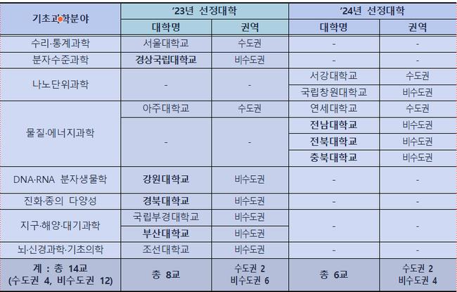 2025년 선정 대학들의 연구분야는 ▲숭실대·이화여대: 수리·통계·AI ▲경희대·충남대: 천체·입자·우주과학 ▲동아대: 원자과학 ▲순천향대: DNA·RNA 분자생물학 등이다.
