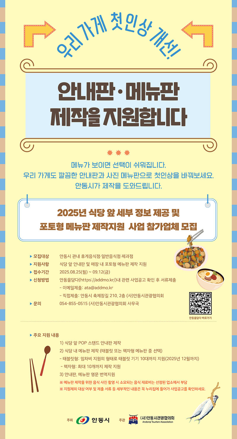 안동시와 (사)안동시관광협의회는 8월 25일(월)부터 9월 12일(금)까지 ‘2025년 식당 앞 세부정보 제공 및 포토형 메뉴판 제작지원 사업’ 참가업체를 모집한다.