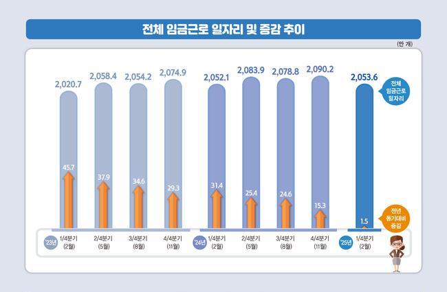 2025년 1분기 임금근로 일자리가 전년 같은 기간보다 1만5천 개 늘어난 것으로 나타났다. 보건·사회복지, 협회·수리·개인 서비스업 등에서 증가세가 뚜렷했으나, 제조업과 건설업을 중심으로 일자리가 줄면서 전체 증가 폭은 제한적이었다.