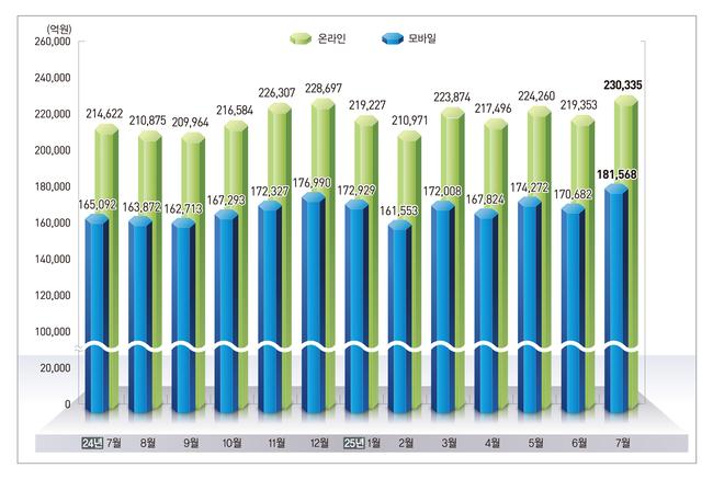 통계청이 발표한 ‘2025년 7월 온라인쇼핑 동향’에 따르면, 지난 7월 온라인쇼핑 총거래액은 23조 335억 원으로 전년 같은 달보다 7.3%(1조 5,713억 원) 증가했다.