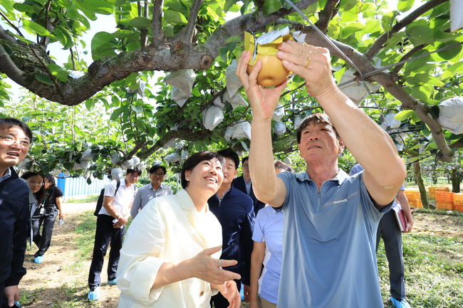 송미령 농림축산식품부 장관은 9월 11일 충남 아산시 둔포면의 배 생산농가와 아산원예농협 과수 거점 산지유통센터(APC)를 방문해 햇배 수확 · 출하 상황을 점검하고 현장 관계자를 격려했다.