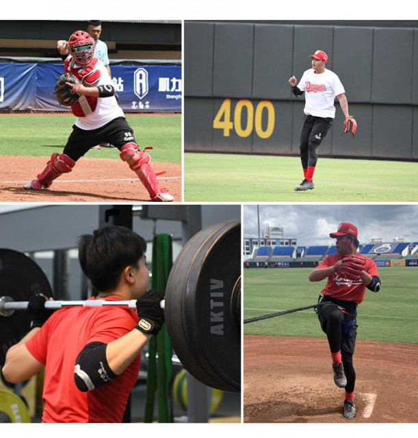 웨이취엔 드래곤스 선수들이 웨이브웨어의 E1, E2 팔꿈치 슬리브 사용 테스트를 진행하고 있다
