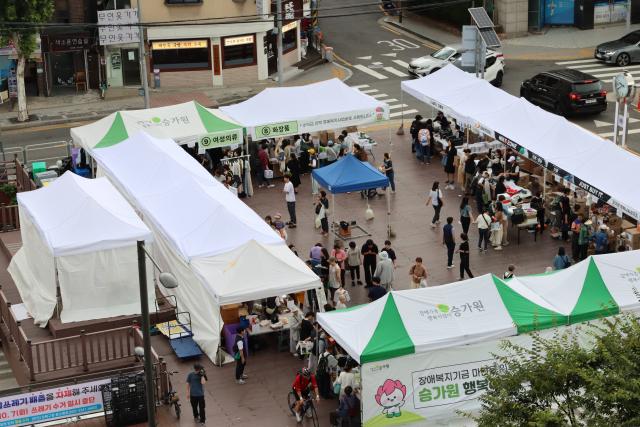 2025년 승가원 행복나눔바자회 전경. 성북구청 바람마당에서 침구류, 의류, 신발, 생활용품, 주방용품 등 12개의 부스로 운영됐고, 기업의 후원 물품을 판매해 약 2100만원의 장애복지기금을 마련했다. 승가원 행복나눔바자회는 매년 9~10월 사이에 열린다