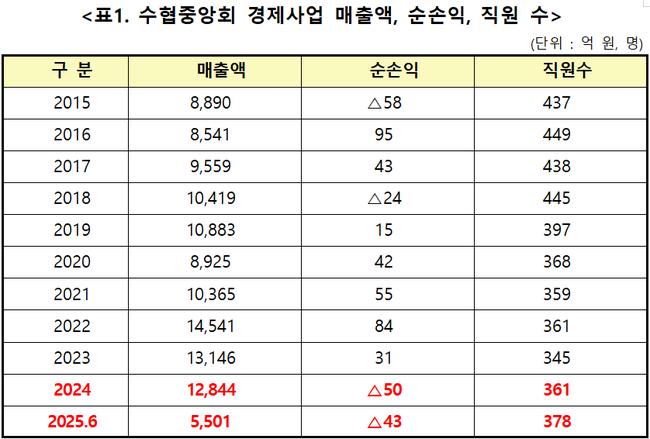 수협중앙회 경제사업 매출액, 순손익, 직원 수