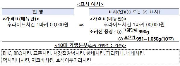 식약처는 12월 15일부터 치킨을 판매하는 10대 프랜차이즈 가맹점 약 1만2,560곳을 대상으로 `조리 전 총 중량` 표시를 의무화한다.