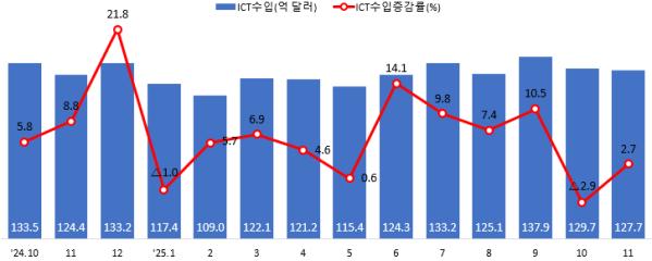 산업통상부와 과학기술정보통신부는 15일 11월 ICT 수출이 254.5억 달러로 전년 동월 대비 24.3% 증가하고 무역수지가 126.9억 달러 흑자로 역대 최대를 기록했다고 밝혔다.