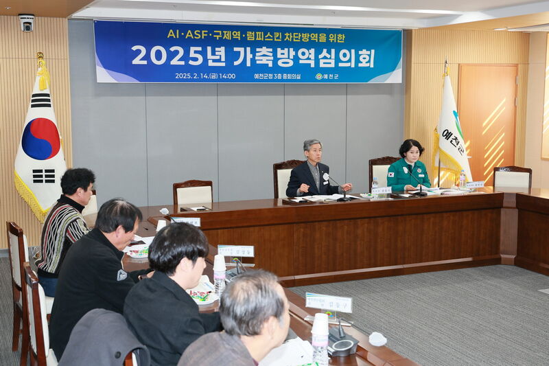 예천군(군수 김학동)은 14일(금) 오후 2시, 군청 중회의실에서 강상기 부군수, 권용준 경제농림국장, 관계 기관, 농․축협, 수의사회, 축종별 축산 단체 대표 등 14명이 참석한 가운데 2025년 가축방역심의회를 개최했다.