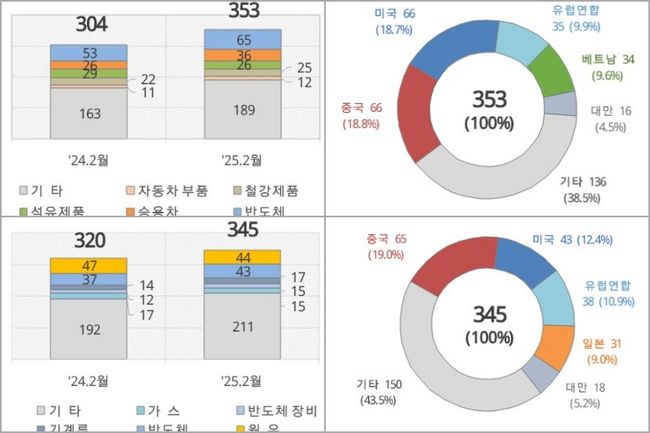 관세청은 2월 21일 2월 1~20일간의 수출입 현황을 발표하며, 수출이 353억 달러로 전년 동기 대비 16.0% 증가했고, 수입은 345억 달러로 7.7% 증가했다고 밝혔다. 이에 따라 무역수지는 8억 달러 흑자를 기록했다.