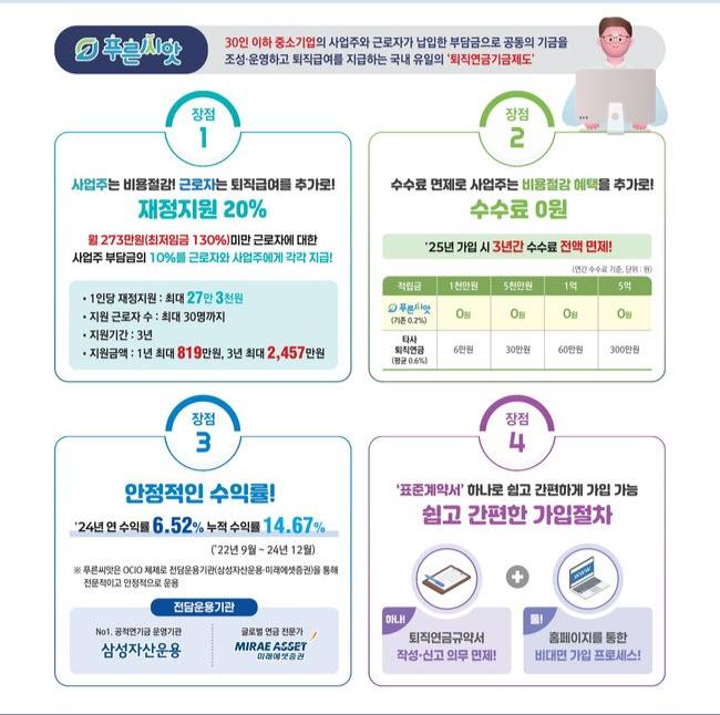 특히, 푸른씨앗은 국내 유일의 공적 기금형 퇴직연금으로, 근로복지공단이 자산운용기관과 협력해 전문적으로 운용한다. 2024년 누적 수익률은 14.67%, 연간 수익률은 6.52%로 일반 퇴직연금 대비 높은 성과를 기록했다.