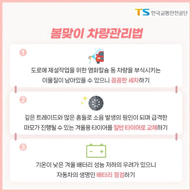 한국교통안전공단(TS, 이사장 정용식)이 봄철을 맞아 자동차 운전자들이 반드시 점검해야 할 주요 사항을 소개하고, 안전한 주행을 위해 철저한 사전 점검을 당부했다.