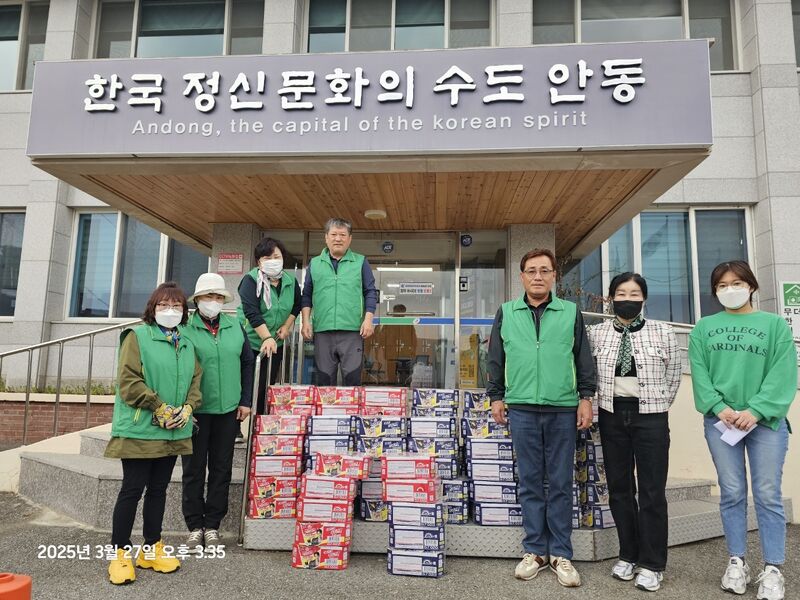 이재원 안동본부 회장은 김미경 여성회장을 비롯한 임원들과 지난2025년 3월 27일(목요일)~28일(금요일) 산불로 피해를 입고 대피하고 있는 대피소를 찿아가 삶의 터전을 잃은 분들께 위로와 사랑의 성품을 전달 하였다 성품은 300만원 상당 으로 컵라면을 안동시청에 담당 직원들과 함께 안동시 관네 (일직면.남선면.임하면.백자리회관.임동면.풍천면.명륜동사무소) 등 전달 하였다