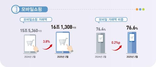 2025년 2월 온라인 쇼핑 거래액이 21조 616억 원을 기록하며 전년 동월 대비 3.5% 증가했으며, 특히 모바일 쇼핑 거래액은 16조 1308억 원으로 전체 온라인 쇼핑 거래액의 76.6%를 차지하며 성장을 견인했다.