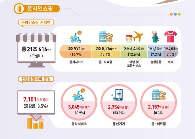 상품군별로는 음식 서비스(10.9%), 통신기기(53.9%), 음·식료품(8.3%) 등이 온라인 쇼핑 성장을 이끌었으며, 거래액 구성비는 음식 서비스(14.7%), 음·식료품(13.4%), 여행 및 교통서비스(12.6%) 순으로 높게 나타났다.
